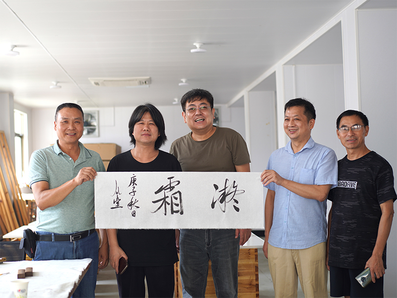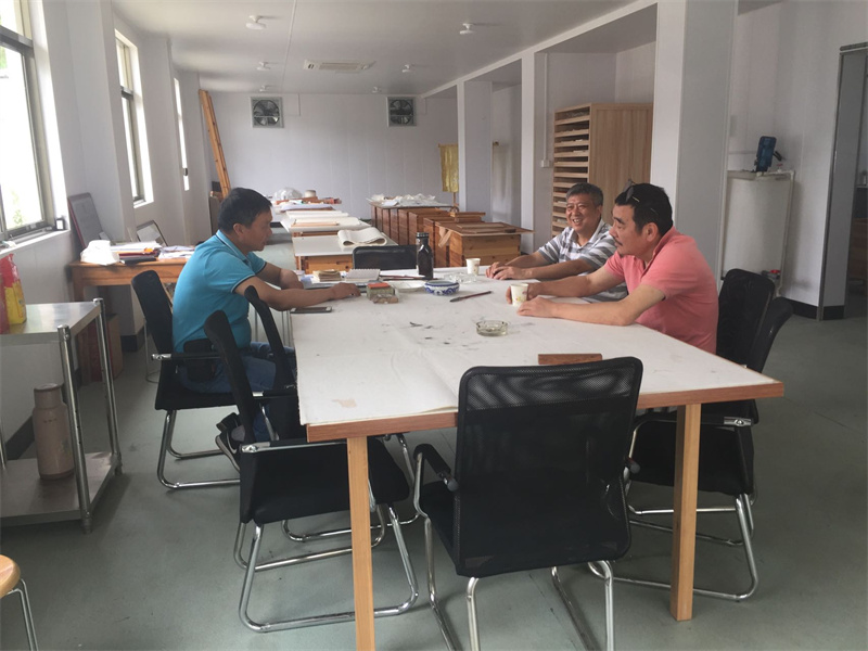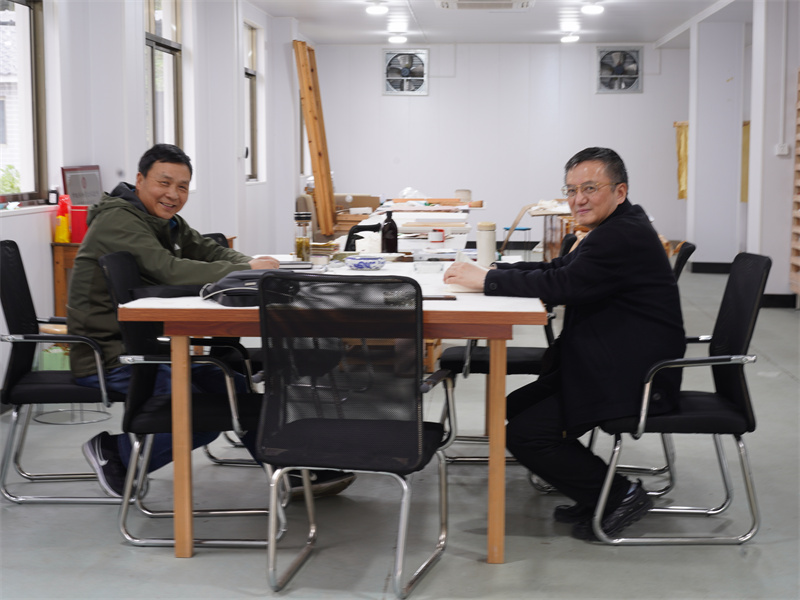 浙江省文化廳新安傳統(tǒng)文化調研,畫家樓森華、樓秋華和版畫藝術家王超在公司。徽州楮皮紙