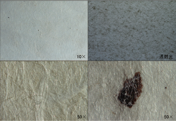 構皮纖維雖不及麻纖維那么長,但遠長于竹纖維,一般在5-10mm 左右。由于構皮本身具有一定的白度,纖維素含量也比較高,因此構皮紙成紙白度一般要高于麻紙和竹紙,構皮紙質地較麻紙綿軟,韌性好,常被稱為“白棉紙”,亦有“蟬翼”、“冰肌”等雅喻。構皮紙紙面的勻度和平滑度一般介于麻紙和竹紙之間,由于蒸煮過程中用到草木灰,構皮紙一般潔白中略偏灰色,紙面纖維在光線照射下會泛出絲質光澤。由于纖維較長不易分散,成紙內常見有未打散的纖維束,形態蜿蜒曲折,兩端多散開呈絮狀(如圖1 左下)。構皮紙在存放一段時間之后,紙面常見有零星的淺銹黃色暈點狀氧化斑,曾有文人墨客因此雅稱其為“桃花紙”。另外,手工抄造的構皮紙在纖維間還常會殘留一些構皮外皮的黑灰色碎屑,這也是構皮紙的一個特征(如圖1 右下)。