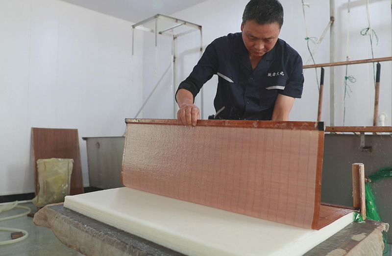 浸泡—→腳踏—→清水蒸煮—→切料—→石灰漿浸泡—→蒸煮—→自然漂洗—→腳踏去石灰水—→日曬雨淋至白色—→踏碓搗細—→滾開的草木水沐泡—→清洗—→再蒸煮—→水漂—→日光曝曬—→揀料—→刀細切或碓舂—→放袋內洗—→入槽加水攪拌—→加紙藥—→打槽撈紙—→壓去水份—→火墻干燥—→揭紙—→整理切邊—→打包。