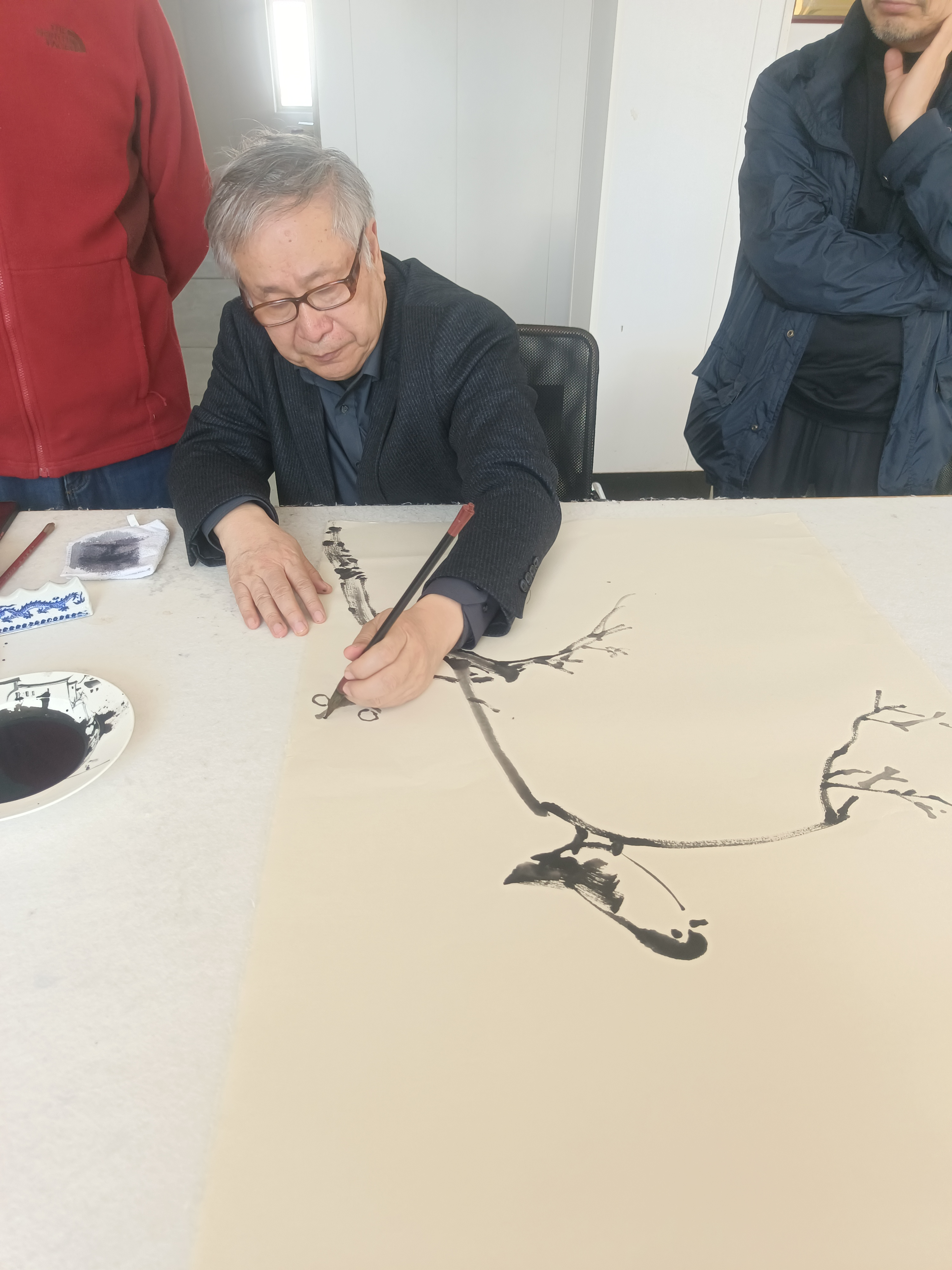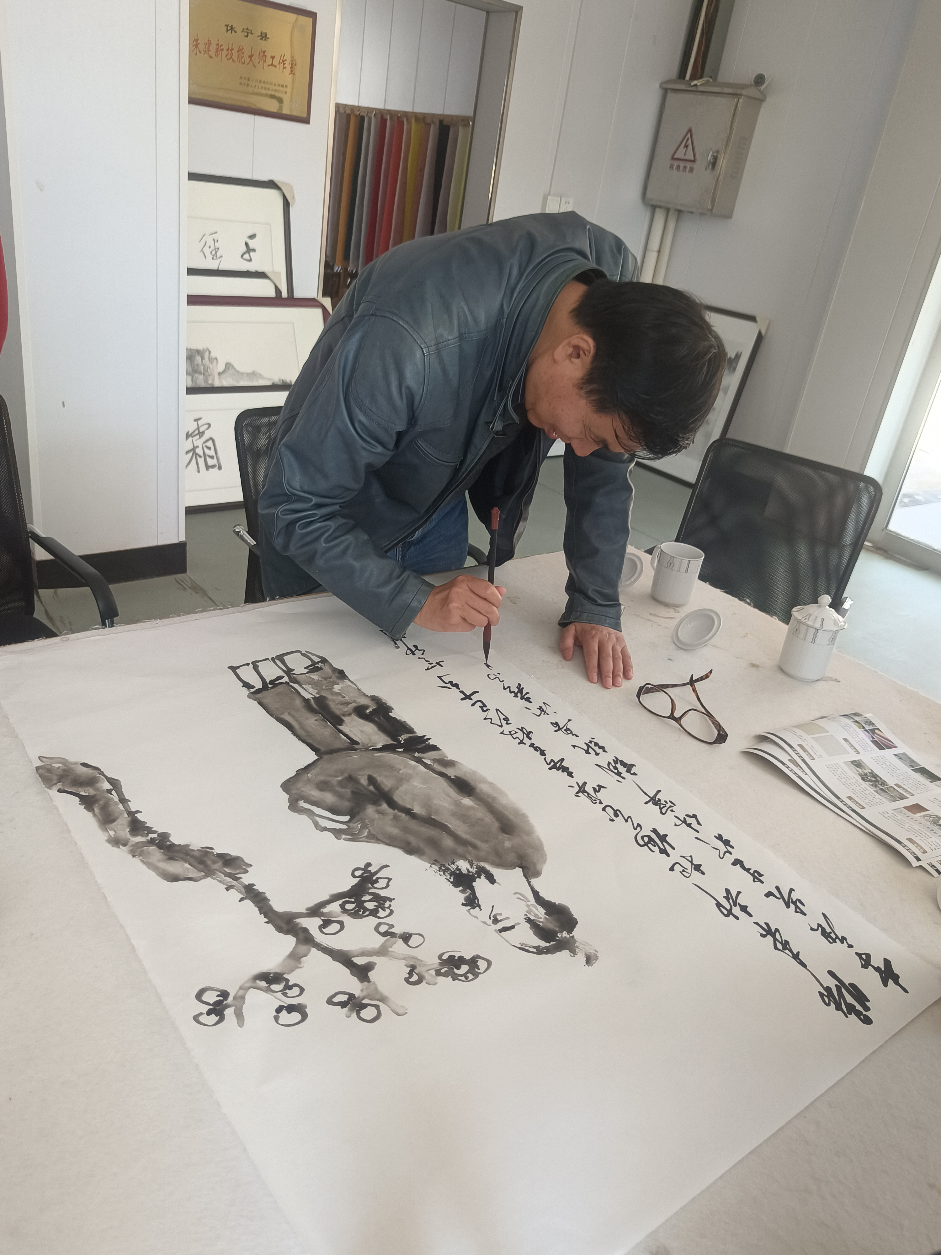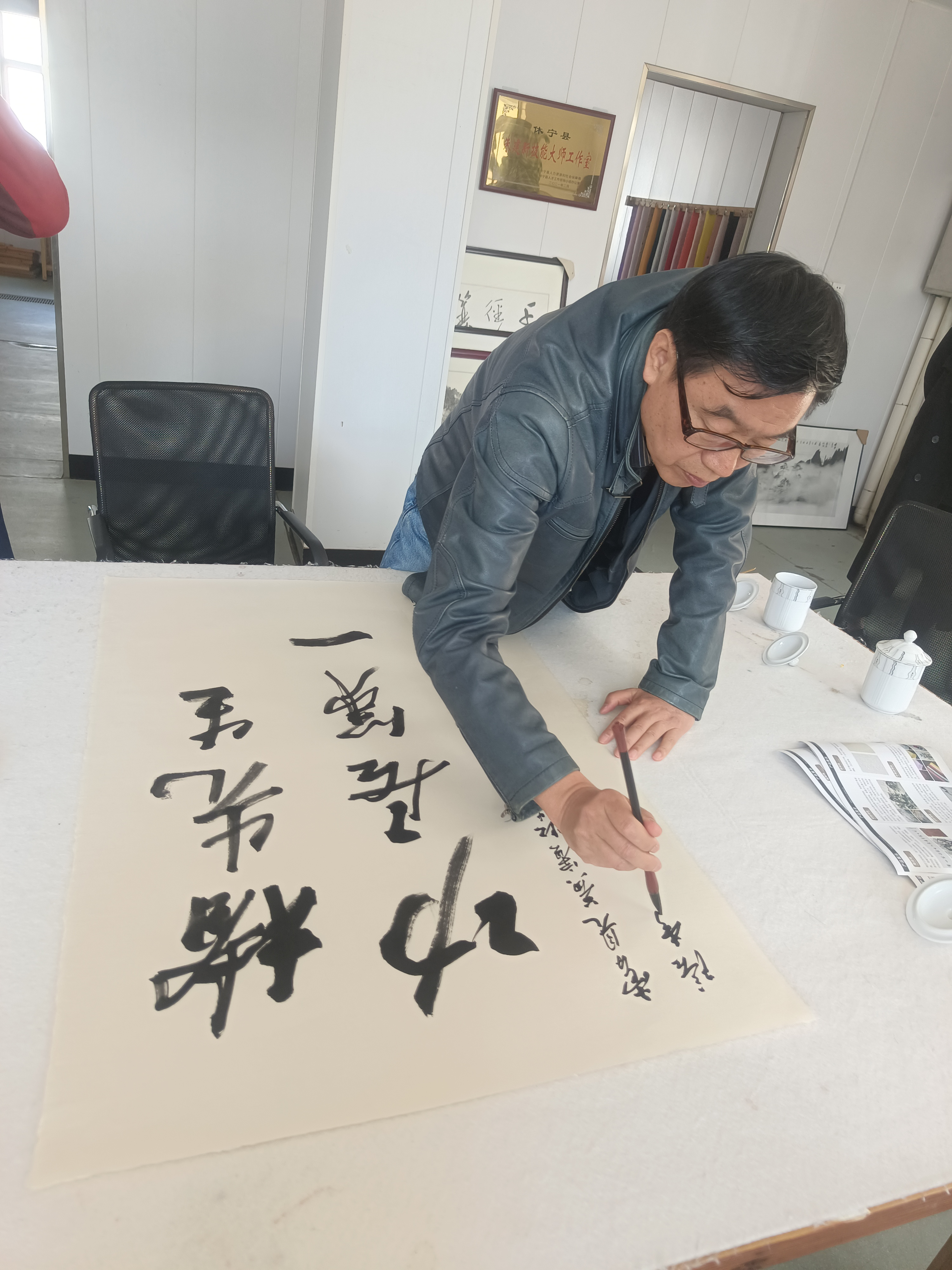 近距離觀摩大師創(chuàng)作,著名畫家李庚老師和著名文化學者、書法家王魯湘老師抽出寶貴時間來公司指導試筆,并為我們留下三幅珍貴墨寶,這是對我們做徽州皮紙的肯定,也是對我們的鞭策,使我們更有信心堅守敬畏之心,匠人精神,做出更好的徽州皮紙。感謝安徽書法協(xié)會會長王云龍全程陪同