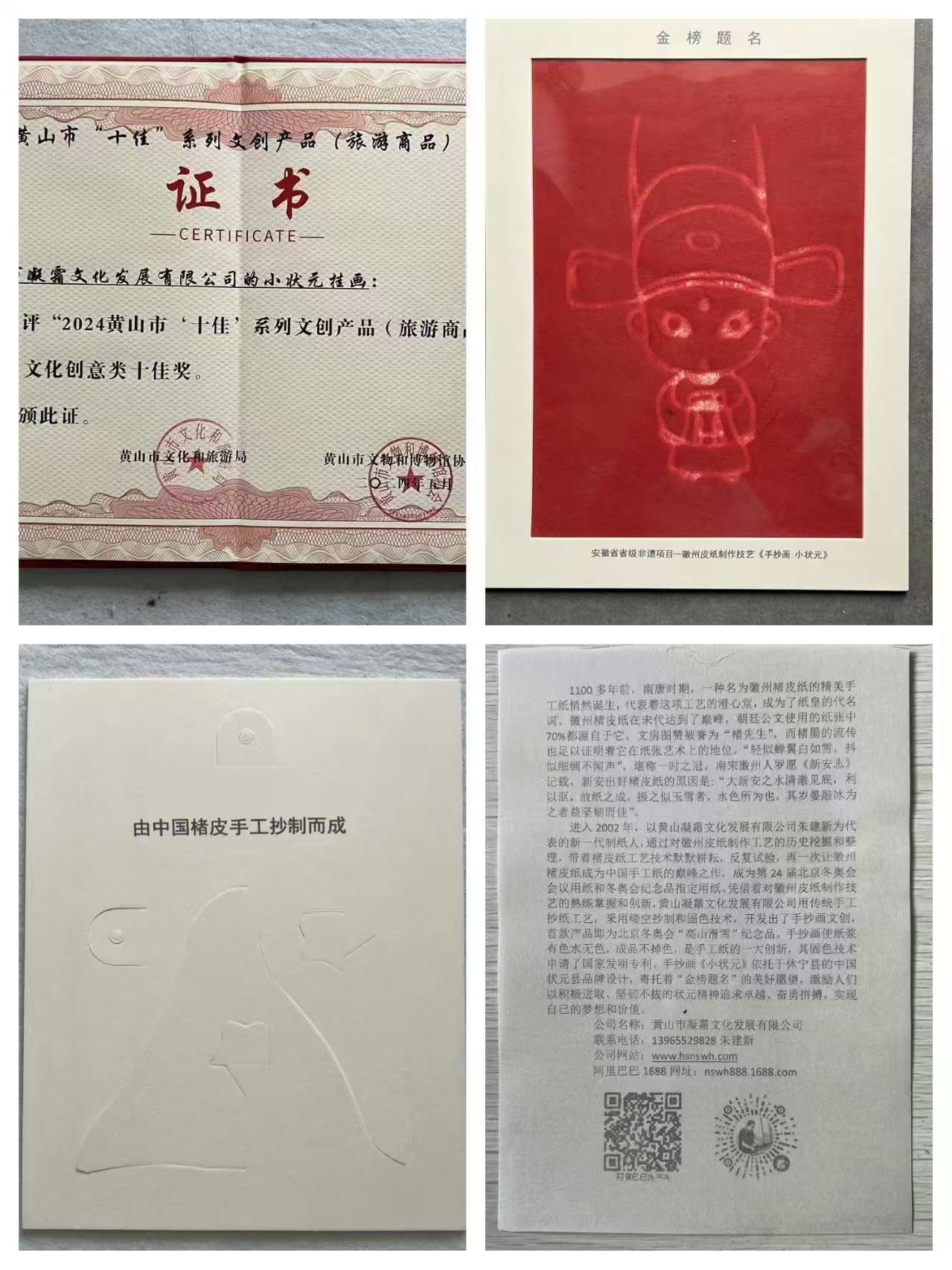 凝霜文化文創《小狀元掛畫》獲2024年黃山市“十佳”系列文創產品(旅游商品)稱號